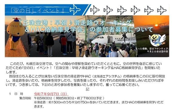 9月7日(日)開催「空の日」イベント!「丘珠空港:早朝♪滑走路ウオーキング&HAC格納庫見学会」の参加者を募集します。(応募締切り:8/22(金)必着)