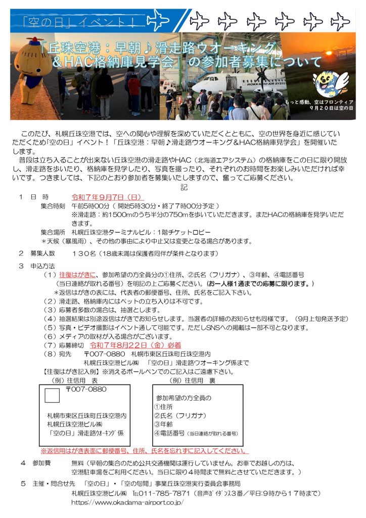 25.8.5 お知らせ 9月7日(日)開催「空の日」イベント!「丘珠空港:早朝♪滑走路ウオーキング&HAC格納庫見学会」の参加者を募集します。(応募締切り:8/22(金)必着) 9月7日(日)開催「空の日」イベント!「丘珠空港:早朝♪滑走路ウオーキング&HAC格納庫見学会」の参加者を募集します。 (応募締切り:8/22(金)必着) 詳しくはこちらのチラシをご覧ください。 シェア Tweet